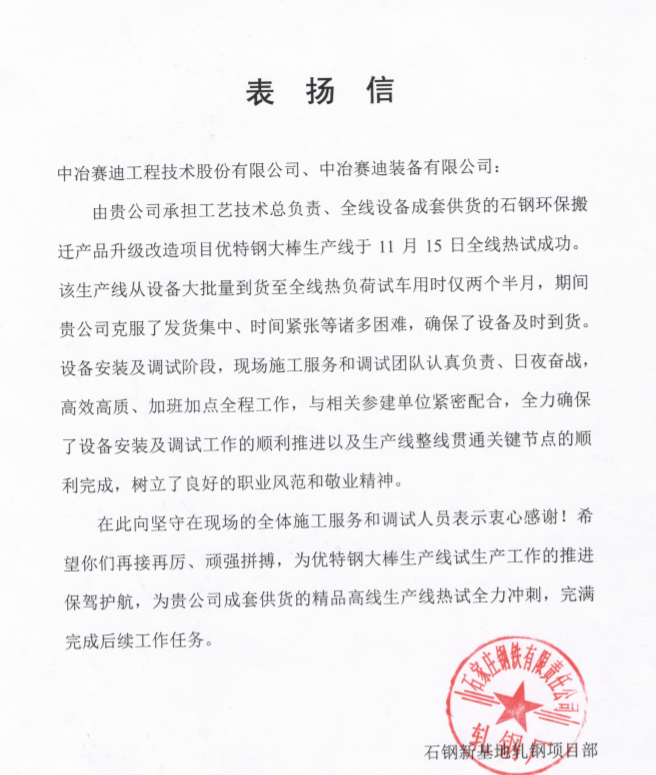 石鋼搬遷大棒&高線項(xiàng)目收到業(yè)主表?yè)P(yáng)信