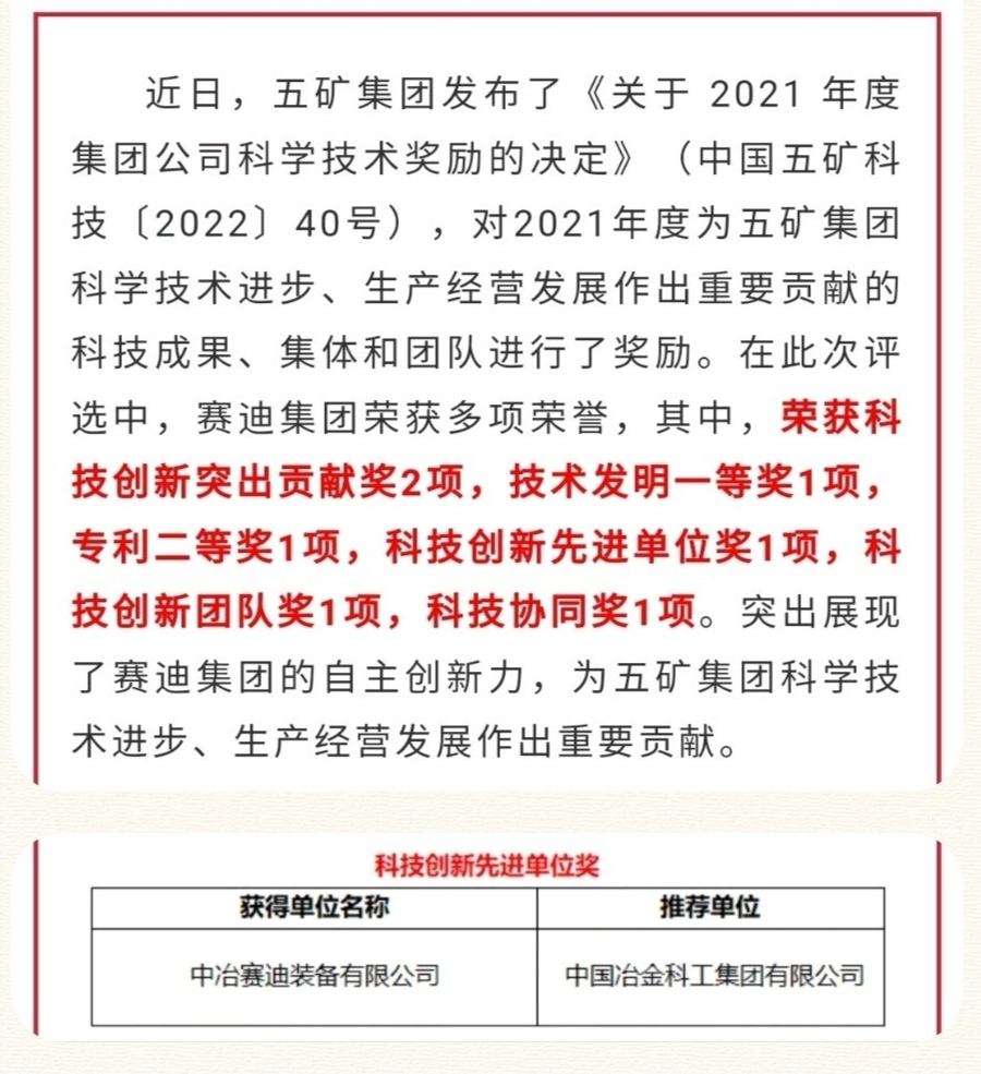 近日,五礦集團印發(fā)了《關(guān)于 2021 年度集團公司科學(xué)技術(shù)獎勵的決定》(中國五礦科技〔2022〕40號)文件,賽迪裝備榜上有名,榮獲2021年度五礦集團科技創(chuàng)新先進單位。